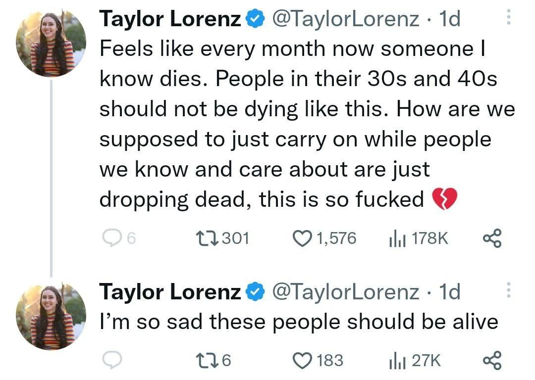 Taylor Lorenz, who glorified the vaccine, wrote hit pieces on anti-vaxxers, and criticized America for not locking down like China, can’t figure out why everyone she knows is dying around her.